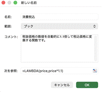 [数式]→[名前の定義]→[新しい名前]ダイアログボックスで、参照範囲にLAMBDA関数式を入れてみましょう。