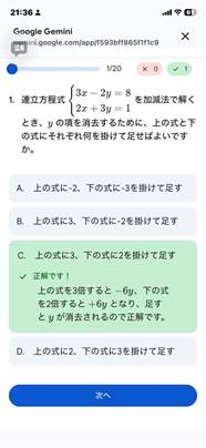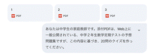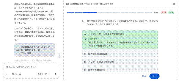 たとえば、元ネタなしにGeminiへ投げかけたプロンプトに対しては、Geminiは動画のような小テストを返してきました。