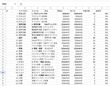 このWBSリストを元に、ExcelやGoogleスプレッドシート等でガントチャートの雛形を作成することも可能です。必要であればお申し付けください。