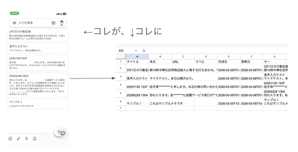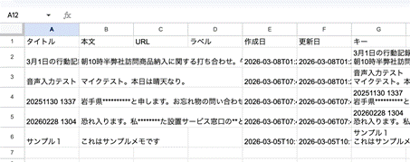 音声からのテキスト変換データ(メモ)がいくつか集まったところで、これらのメモを、一括して、Googleスプレッドシート形式に変換します。