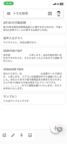 まず、テキストデータの元となる音声データは、スマートフォンのGoogle Keepアプリに新しいメモを作成して、スマホ・マイクに話しかけて取得します。