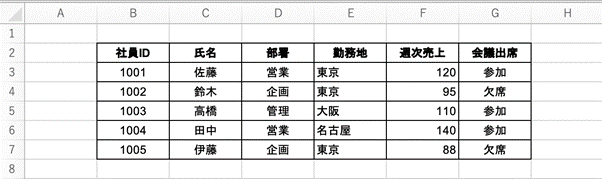 “抱き合わせ”を行った結果、「特定の部署だけに絞って」「氏名と週次売上項目のみ」の抽出された別表が、ごくカンタンに作成されました。