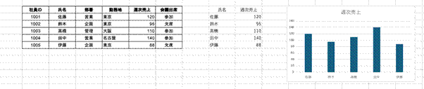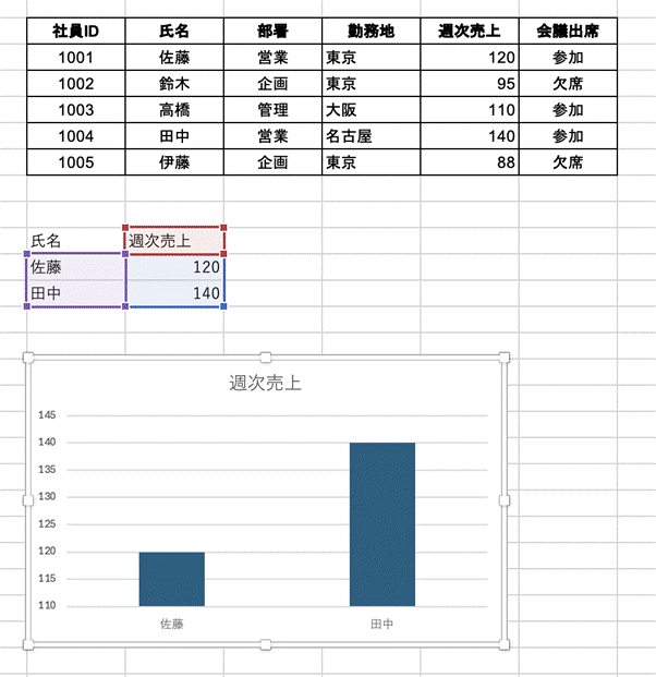 たとえば、上図のようなスタッフ・リストがあった場合に、「氏名」と「週次売上」だけを抽出してグラフを作るとしましょう。
