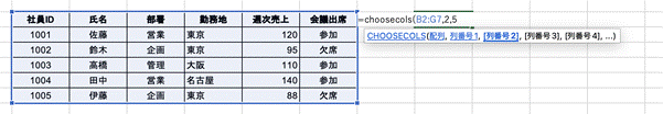 しかし、たとえば「営業部には5列目の”週次売上”だけを報告」する一方で、同じ資料から「総務部には6列目の”出席者”、”欠席者”欄だけを報告」というような、同一資料の切り分けをする場合には、直接列/行番号を指定できるCHOOSECOLS/CHOOSEROWS関数の方が有効なのです。