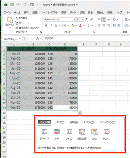 吹き出しで、「書式」「グラフ」「合計」「テーブル」「スパークライン」などの候補が表示されますので、売上データなら「合計」や「平均」を出したり、傾向を見たいときはグラフを自動作成させたりします。